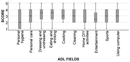 A box-and-whisker plot detailing the degree of difficulty of performing tasks from the different fields of ADLs. Ratings: 1 = with considerable difficulty and 5 = very easily.