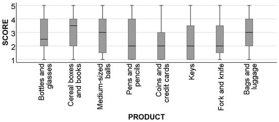 The participants were also requested to assess their usual degree of fulfilling a set of ADLs on a 1–5 Likert scale (1 = with considerable difficulty; 5 = very easily). These questions were based on those presented in OPUS-F, but they were grouped by fields of key tasks for personal autonomy. They were also asked to rate their performance when employing specific products that require different grasp types.