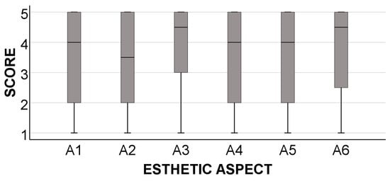 A box-and-whisker plot illustrating the score obtained for each assessed aspect related to socket esthetics. Ratings: 1 = strongly disagree and 5 = strongly agree. The statements are labeled as detailed in Table 5.