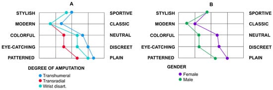 They were also asked to use a semantic differential scale to evaluate the following design characteristics: stylish/sportive, modern/classic, colorful/neutral, eye-catching/discreet and patterned/plain. The obtained results are presented in Figure 11 after distinguishing them based on degree of amputation (A) and gender (B).