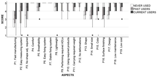 The aspects that were generally rated as the most important ones included (P4) comfort, (P5) breathability, (P6) an easy fixing system, (P7) a stable fixing system, (P8) a light weight, (P9) “Allows me to perform the ADLs I need”, (P10) “Allows me to use the products I need”, (P11) “Allows me to carry the weight I need”, (P12) “Has enough rigidity and does not deform while performing high-stress tasks”, (P18) low maintenance required and (P19) low cost. Conversely, aspects related to the manufacturing process and esthetics were considered less important. These results align with the pyramid hierarchy of product needs proposed by Jordan [49], with functionality at the base, usability in the middle and pleasure (esthetics and use experience) at the top.