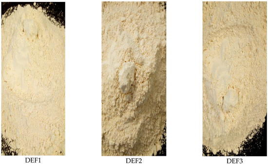 The proximate composition of defatted egusi flour in Table 1 shows a low moisture content, which differed significantly (p ≤ 0.05), with DEF3 (75 °C and 600 bar) having the lowest moisture content. The recommended water intake of egusi flour can vary depending on its specific application and the desired consistency of the final product. Generally, when using egusi flour as a thickening agent in soups or stews, the amount of water added should be adjusted based on personal preference and the desired thickness of the dish. The protein content was 48.4% for DEF2 (55 °C and 600 bar) and 60.4% w/w for DEF1 (60 °C and 450 bar), with a p-value of <0.05, indicating a significant difference. The protein difference could be attributed to the effects caused by the high pressure (600 bar) and lower temperature (55 and 60 °C) during extraction. Protein is structurally modified at high pressure, while low temperature reduces the defatted flour extractible components [26]. The protein content differences between egusi flour obtained via supercritical fluid extraction (SFE) and conventional heat and solvent oil extraction methods can be attributed to the preservation of protein integrity, minimal solvent interaction, selective fat removal, and reduction in oxidative degradation provided by SFE. These scientific elements work together to explain why egusi flour prepared using SFE has a higher protein content than standard extraction methods [27]. The protein content of raw and defatted egusi flour was higher than that of cereals (7.5–12 g/100 g) [28] and eggs (12.8 g/100 g) [29]. The protein in egusi flour is high compared to defatted sunflower seed, soy flour, and flaxseed flour, which are 8.20, 44.7, and 20.6 g/100 g, respectively [30]. Protein is a significant body component, essential to every cell [31]. Repairing and building muscles require substantial amounts of protein; a lack of protein would also negatively affect nails and hair [28,32]. The colour of egusi flour is a creamy white colour, as shown in Figure 1, which offers a viable high-protein alternative flour to vegetarians and those who cannot afford high-protein meat and meat products. It could also be a significant raw material for ready-to-use therapeutic food (RUTF).