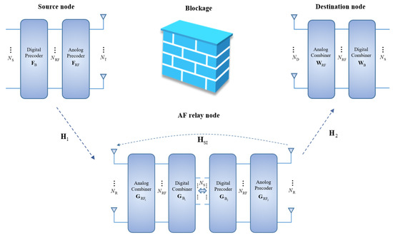 - Jiang, L.; Jafarkhani, H. mmWave Amplify-and-Forward MIMO Relay Networks With Hybrid Precoding/Combining Design. IEEE Trans. Wirel. Commun. 2020, 19, 1333–1346. [Google Scholar] [CrossRef]