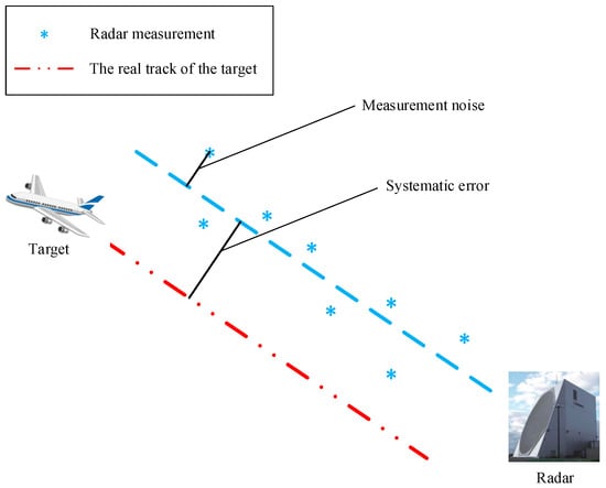 Radar is the main means of the monitoring of and early warnings for non-cooperative targets at sea [1,2]. The modern radar represented by phased arrays can detect and track multiple targets, such as ships, aircrafts, and missiles at the same time because of its fast beam control speed [3,4]. However, due to the influence of mechanical structure deflection, installation platform tilt, the aging of internal electrical components, external electromagnetic interference, and other factors [5], radar measurements often have various forms of error (as shown in Figure 1), and the maximum error can even reach the magnitude of kilometers [6], therefore it is necessary to calibrate the radar regularly. In previous studies, radar observation errors were usually divided into random errors and systematic errors [7]. The random error can be eliminated using a filtering algorithm, and the impact on the subsequent measurement results is relatively small [8]. The systematic error is the fixed deviation generated by the characteristics of the radar system itself and the interaction with the external environment, which cannot be removed through the use of filtering, and needs to be estimated in advance to then be compensated for. This process is called radar calibration.