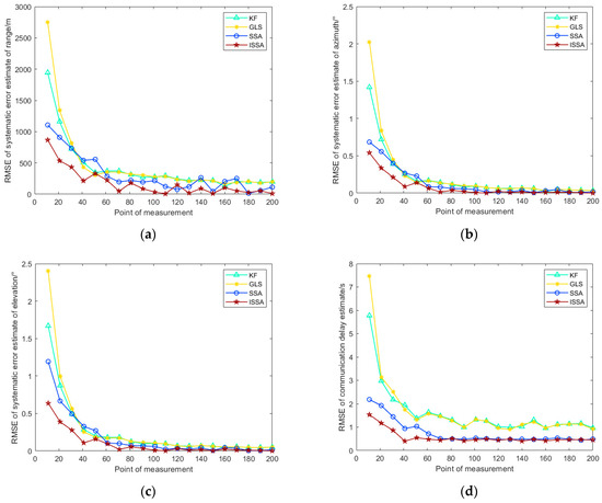 The RMSE of the radar systematic error estimation under different measurement points. (a) Range systematic error; (b) Azimuth systematic error; (c) Elevation systematic error; (d) Communication delay.