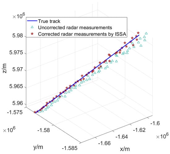 Obviously, the corrected radar measurement track is closer to the real track, but, due to the existence of measurement noise, there is still a certain difference between the radar observation track and the real track, which can be reduced through subsequent data processing (filtering, etc.).