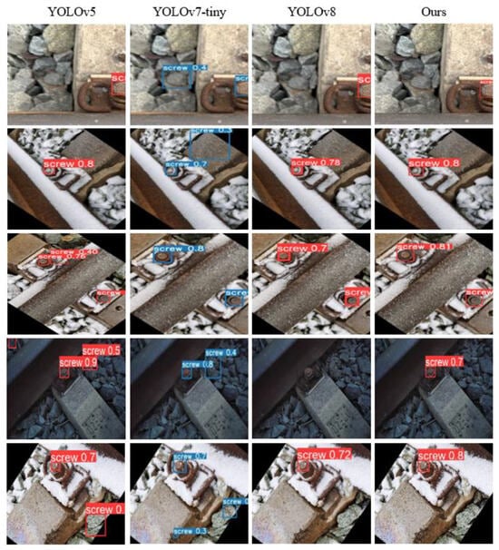 The fastener screw detection performance of the fastener screw maintenance robot may be significantly interfered with when encountering unexpected environmental factors. For example, the hexagonal contour of the fastener screw bears a resemblance to a few ballast contours, making it challenging to differentiate between them against complex environmental backgrounds. Additionally, foreground occlusions from other trash may obstruct the complete exposure of the fastener screw, further complicating detection tasks.