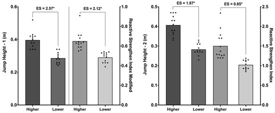 A median split analysis was performed, creating higher and lower JH, RSImod, and RSI groups for each jump in the CMRJ test. This was completed to determine whether subjects with higher CMRJ metrics exhibited greater strength or faster performance during the linear sprint and 505 COD tests. The difference between the higher and lower groups was assessed with Mann–Whitney U tests, with statistical significance set at p < 0.05, and Hedges’ g ES were used to determine the magnitude of differences between higher and lower jump performance groups. These ES were interpreted as g < 0.35 = trivial; 0.35–0.80 = small; 0.81–1.50 = moderate; and >1.5 = large [31].