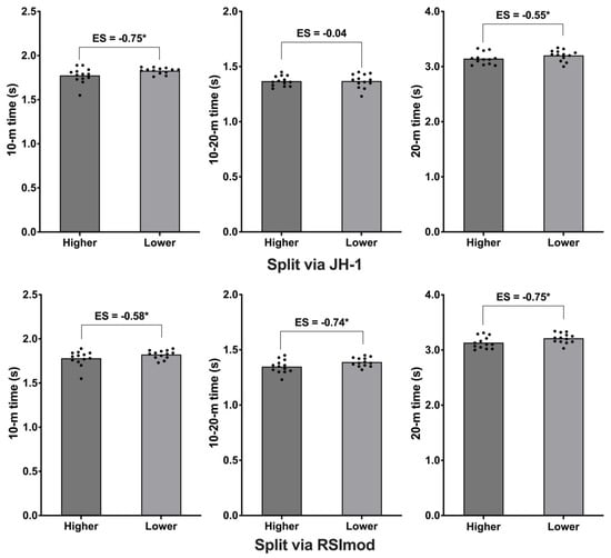 Differences in 20-metre linear sprint time between the higher and lower groups in JH-1 and RSImod during the first jump of the CMRJ test. * Significantly different between groups (p < 0.05).