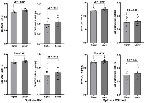 Differences in 505 COD time between the higher and lower groups in JH-1 and RSImod during the first jump of the CMRJ test. * Significantly different between groups (p < 0.05).
