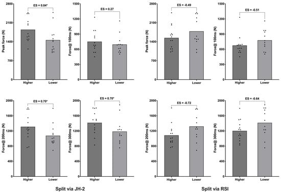 Differences in IMTP force metrics between the higher and lower groups in JH-2 and RSI during the second jump of the CMRJ test. * Significantly different between groups (p < 0.05).