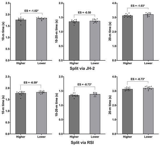 Differences in 20-metre linear sprint time between the higher and lower groups in JH-2 and RSI during the second jump of the CMRJ test. * Significantly different between groups (p < 0.05).