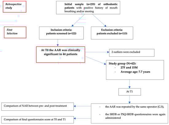 This study was conducted from an initial sample of 235 orthodontic patients, with a positive orthodontic history for oral breathing and/or snoring, provided by the same private practice (M.M). Specifically, the presence of the following: oral breathing related to obstructive cause (hypertrophy of adenoids and/or tonsils; hypertrophy of turbinate; septal deviation) or non-obstructive cause; disturbed sleep; and OSAS. All patients underwent a first orthodontic examination after otorhinic evaluation with a final diagnosis of mouth breathing.