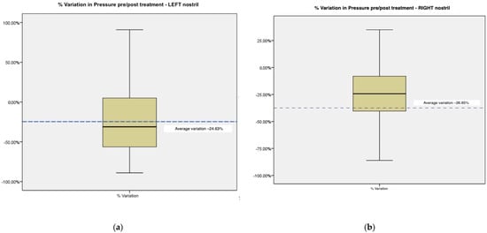 Distribution of pre-/post-treatment airflow change in the left (a) and right nostrils (b). (a) % variation in pressure pre-/post-treatment—left nostril; (b) % variation in pressure pre-/post-treatment—right nostril.