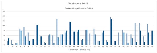 - SRDB and PSQ-SRDB Questionnaires (pre- and post-treatment): SRDB questionnaire was submitted to the parents of 36 patients in the study group. At pre-treatment, only in one case did it produce an outcome close (final score of 29) to that considered clinically significant for OSAS (greater than or equal to 33) (Figure 4). Evaluating the modification between T0 and T1 in the overall final score, completion of the above questionnaire was not statistically significant, if not confounding at times. In fact, although 49% of the subjects (17 patients) manifested a reduction in score following RME treatment, in contrast, 31% (11 cases) had an unchanged final score between pre- and post-treatment. Finally, in 20% of the cases (7 subjects) there was a worsening of the total score between T0 and T1.