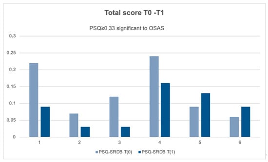 Figure 4. Questionnaire scales for sleep-related breathing disorders (SRBDs).Similarly, the PSQ-SRDB questionnaire, administered to six subjects in the study group, in no case led to a final score of 0.33 or higher, a cut-off considered on the basis of the current literature to be significant for OSAS (Figure 5). Assessing the overall change in the score between pre- and post-treatment, a reduction in the score was observed in 67% of cases (four patients); in contrast, an increase is seen in 33% of cases (two subjects). So, once again the completion of the parental questionnaire was not found to be statistically significant.