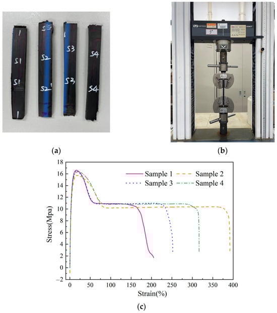 Figure 1b shows. The initial clip distance was 60 mm and the loading procedure was controlled by displacement to obtain the complete stress–strain curve of the material. The initial loading speed was 0.60 mm/min, which increased to 5.00 mm/min after a displacement of 0.18 mm until the specimen fractured.