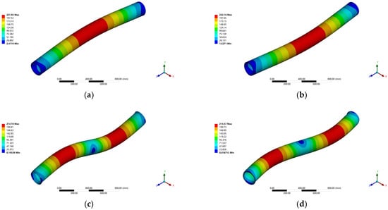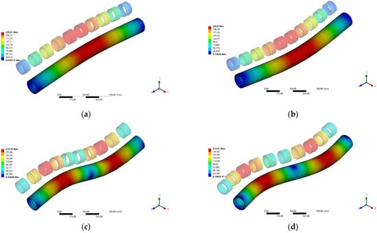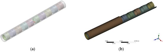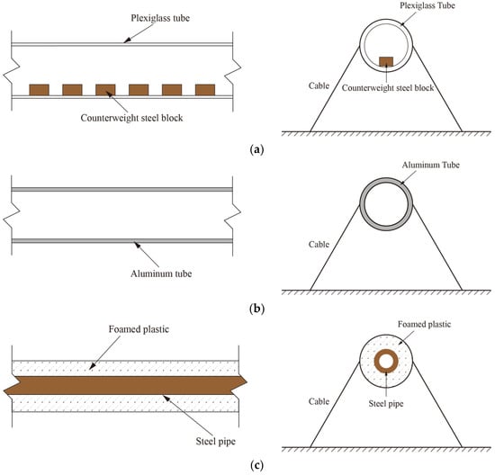 Figure 2c) features a steel tube encased in foam plastic. However, foam plastic tends to absorb water, leading to an increase in the model’s weight and a decrease in the buoyancy–weight ratio. These changes can significantly affect the dynamic characteristics of the model. Additionally, sensors can only be installed on the surface due to its solid structure, which will impact the external contour of the model and the flow field around the structure.