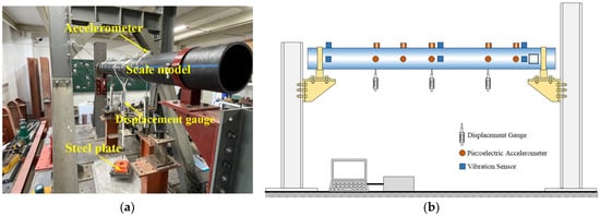Figure 2b). The plexiglass tube model uses a plexiglass tube to satisfy the geometric similarity and employs counterweight steel blocks to maintain the buoyancy–weight ratio. The density of the aluminum tube is high, so there is no need to install additional counterweights. These rigid models cannot simulate the elastic deformation of the tunnel body, thereby they inadequately represent the hydrodynamic behavior of SFTs, such as the fluid–structure interaction and vortex–induced vibration. The hydroelastic model of the SFT can effectively make up for these shortcomings. The model tube can undergo elastic deformation and meet the elastic similarity. The steel pipe elastic model (