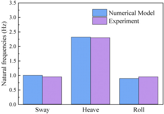 (3) Following the fabrication of the model, its dynamic characteristics were tested. A series of experiments were conducted, including model mass tests, static load tests, free decay tests, and white noise wave tests in a water tank. The results of these experiments showed good consistency with the outcomes of numerical simulations, with relative errors all being less than 10%. This demonstrates that the model is capable of simultaneously satisfying both the Froude and the Cauchy similarity principle.