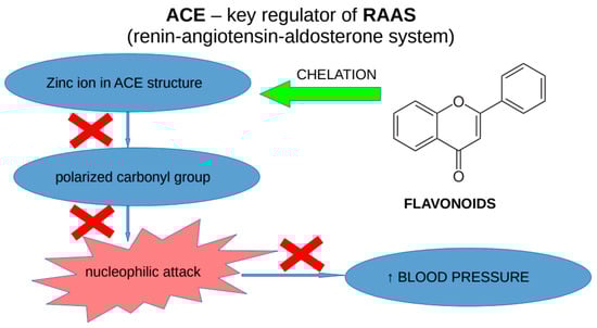 The role of flavonoids in regulation of blood pressure via chelation with the zinc ion located on the active site of ACE (angiotensin-converting enzyme); ↑—increase in blood pressure.