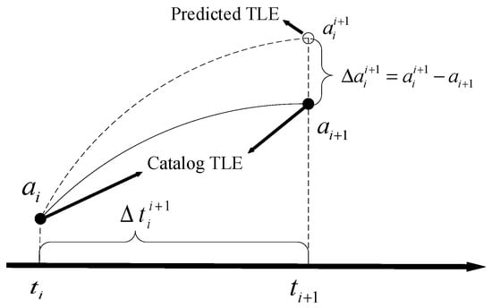 TLE sets serve as a crucial data format, encapsulating the essential orbital parameters of Earth-orbiting objects at a specific epoch. For instance, TLE data typically comprise orbital information, including the NORAD ID, B* drag term, orbital inclination, eccentricity, and mean motion of the space target. The Simplified General Perturbations 4 (SGP4) model, developed in the 1980s, is an analytical method encapsulating orbital information to form Two-Line Element (TLE) sets. Unlike complex numerical integration methods, SGP4 simplifies the satellite perturbation model, significantly reducing computational requirements while providing a position accuracy of approximately 1 km. This capability enables the rapid cataloging of thousands of space objects. It is important to note that TLEs must be computed using the SGP4 model for a reliable determination of an object’s position and velocity. Thus, we employed the SGP4 model to calculate the prediction errors of TLEs, as illustrated in Figure 1, depicting the sample generation process. The TLE values’ track parameter at time is extrapolated to to obtain , and the value at is utilized to obtain track parameter . The predicted values of the orbital parameters are subtracted from the TLE values to obtain the prediction intervals and prediction errors . Dividing the two quantities yields the rate of change of the prediction errors of the orbital parameters . Similarly, the change rate of the m prediction errors for a single element is obtained by extrapolating the TLE value at time to time , to where the subsequent m values refer.