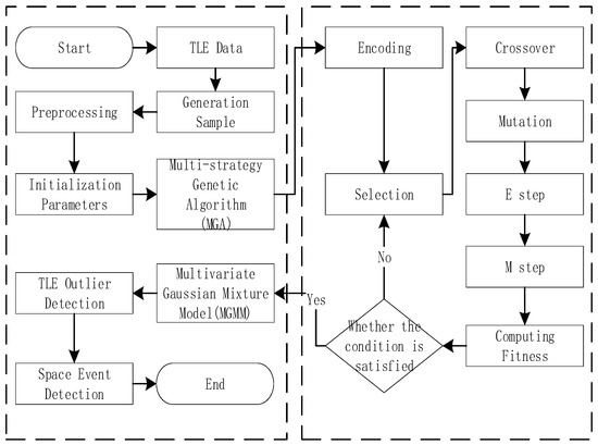 The remainder of this paper is structured as follows. Section 2 describes the TLE outlier and space event detection method, including sample data generation, the MGMM, and the MGA. Section 3 presents the experimental results and compares the performances of the proposed and GMM methods. Section 4 provides the discussion and the conclusion.