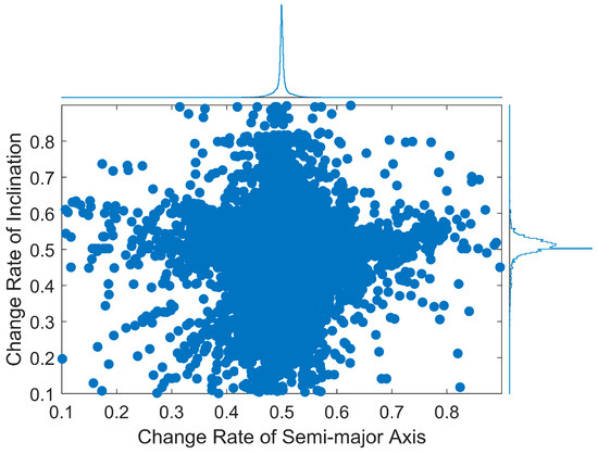 To visually showcase the effectiveness of the methods proposed in this paper, we present the results using histogram scatter statistics, as depicted in Figure 3. These results illustrate that the relationship between the semi-major axis and the rate of change of the orbital inclination is not independent, indicating that using a one-dimensional Gaussian mixture model for the analysis may not be appropriate.