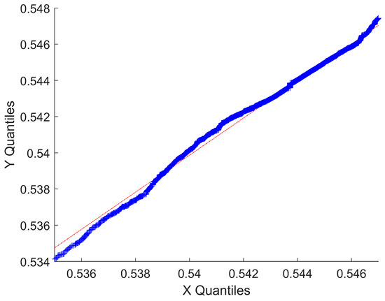 In this study, a multi-strategy genetic algorithm (MGA) is employed to estimate MGMM. The training process is illustrated in Figure 4. As depicted in Figure 4, the average fitness within the population and the fitness of the optimal individual converge to a consistent result after approximately 20 iterations. This suggests that the MGA utilized for estimating the MGMM parameters can accelerate the convergence speed and identify the global optimal solution in the solution within a certain timeframe. In addition, we compared the statistical properties of our samples and models to ensure that the obtained model effectively captures the intrinsic structure of the samples. Consequently, Figure 5 illustrates a quantile–quantile (Q-Q) plot of the sample model, demonstrating whether the model’s distribution aligns with that of the complete training data. The ‘X quantiles’ are derived from the sample data, while the ‘Y quantiles’ originate from the generated data of the learned model. The fact that the X and Y quantiles on the Q-Q plot form a straight line indicates that the resulting model conforms to the same distribution as the sample data. This observation validates the effectiveness of our proposed method in learning the distribution structure of multiple variables within the TLE data samples.