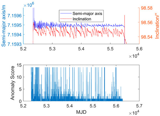 The two-line element (TLE) catalog created by the North American Aerospace Defense Command (NORAD) is the most complete catalog of orbital information for describing the positions and velocities of space targets. Due to its provision of orbital information, TLE plays a vital role in satellite orbit prediction, collision avoidance, orbit tracking, and other fields. However, TLE data carry inherent uncertainties and errors arising from factors such as the quality of the observation data, loss of computational accuracy, and simplifications in models. Moreover, NORAD do not furnish information regarding their accuracy; thus, directly utilizing TLE data may pose potential risks or compromise the stability and reliability of subsequent research outcomes. Two TLE outlier and space event detection methods using historical TLE data have been used. The first method utilizes the semi-major axis or inclination for maneuver detection. For example, several researchers [5,6,7,8] used a moving window to fit the semi-major axis and predict future movements. This approach averages the data in the window. The results depend on the window size, which is difficult to determine due to the irregularity of the TLE release time. Some researchers have detected maneuvers by assuming that the semi-major axis of the target is highly variable [9,10]. The second object detection method is an algorithm based on a probabilistic statistical approach. It does not determine if the target orbit is stable but evaluates whether the TLE data are consistent with the target’s predicted movement [11]. References [12,13] conducted maneuver detection experiments assuming a Gaussian distribution and using discriminative methods, such as the Euclidean or Mahalanobis distance. However, due to large fluctuations in the TLE’s accuracy, it is difficult to detect low-thrust satellite maneuvers [14].