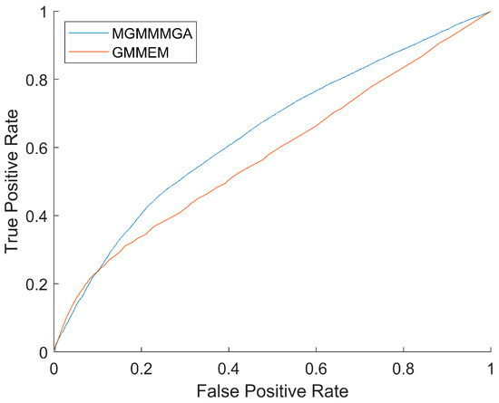 The 95th quantile was then utilized to establish the anomaly detection threshold, and the sample data sequence was processed to identify outliers. The outcomes of the outlier detection are illustrated in Figure 6. For clarity, we define an ‘outlier’ or ‘anomaly’ based on the magnitude of the deviation between adjacent measurements rather than predicted errors. Specifically, deviations in orbit inclination greater than 0.003° and semi-major axis deviations approximately exceeding 20 m are considered significant. These thresholds are not exact figures but rather represent a scale of detectable anomalies, as our anomaly score is a composite index derived from the loss function values of these two variables. It is, therefore, not feasible to provide an exact size for any single variable. This approach ensures that our method can detect TLE outliers of a significant size that may not be identifiable by simpler methods. It is evident that there is a notable presence of outliers in the TLE when there are frequent changes in the orbital elements of the cataloguing data. Therefore, it becomes imperative to enhance responsiveness through the robust correction function, consequently refining the accuracy of outlier detection and thereby bolstering the detection of historical maneuvers. Building upon the results of the outlier detection, the maneuver detection process is employed to detect historical maneuver events. In order to assess the efficacy of the proposed method for the detection of maneuvers, the Receiver Operating Characteristic (ROC) plots for both the MGMMMGA and GMMEM methods are presented in Figure 7. It should be noted that the GMMEM is a Gaussian Mixture Model (GMM) obtained using the Expectation Maximization (EM) algorithm. The ROC plot of the MGMMMGA method was observed to be closer to the upper left corner, indicating that our model outperforms the GMMEM method. In terms of the area under the curve (AUC), a higher AUC indicates superior performance in maneuver detection. The results showed that the area under the curve of the MGMMMGA method was 10% higher than that of the GMMEM, which can effectively improve the maneuver detection performance and lay a solid groundwork for understanding subsequent space target motion patterns and orbits.