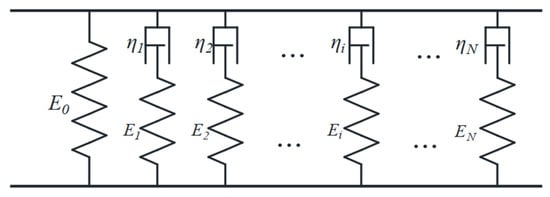 Equation (5) can be expanded into Equation (6), where represents the limit for an infinitely small relaxation time, and denotes the limit for an infinitely large relaxation time. represents the number of Maxwell models. When , is considered infinitesimal, whereas when , is regarded as infinite.