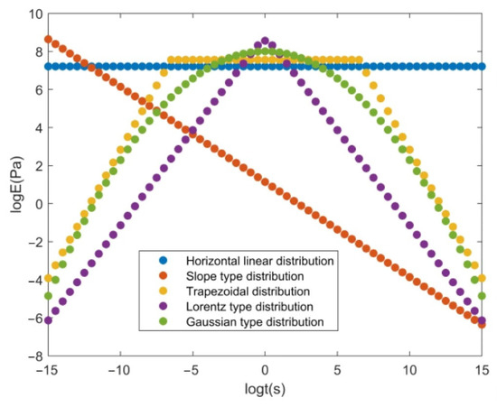 Based on the findings from Section 3, the relaxation spectral lines outside the relaxation time boundary can be discarded. It is imperative to evaluate whether the reduced relaxation spectrum effectively represents the unreduced relaxation spectrum. This analysis mainly focused on four distribution forms of the relaxation time spectra: slope, trapezoid, Lorentz, and Gaussian. The logarithmic time interval of the relaxation modulus function was set to [−16, 16]. The relaxation modulus function curve was generated by plotting a point at every 0.1 unit of logarithmic time. For each distribution form, the relaxation time spectra with 61 spectral lines and a time interval of 0.5 logarithmic units, and their corresponding relaxation modulus curves, are illustrated in Figure 3, Figure 4, Figure 5 and Figure 6.