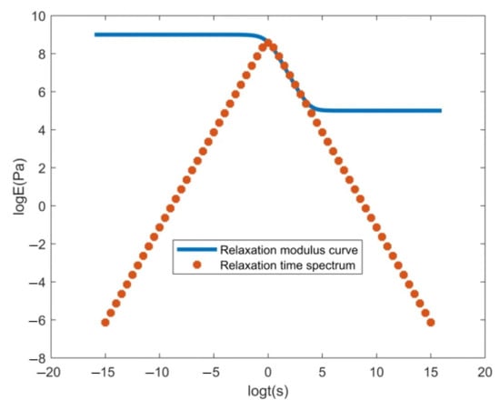 In Equation (9), represents the test time and denotes the relaxation time. Equation (9) typically delineates the boundary between testing time and relaxation time, enabling the establishment of a range of relaxation times based on the testing time range. For a given testing time range (, ), the value of the exponential decay function of the relaxation spectral lines located outside four logarithmic units to the right of can be considered as 1. Under this condition, the spectral strengths of each spectral line satisfying the condition can be treated independently from each Maxwell unit, and their sum is regarded as a constant. This constant can be regarded as the Young’s modulus of the model. The impact of all relaxation spectral lines located outside the two logarithmic units to the left of is almost zero, hence they can be discarded. This essentially entails disregarding a substantial number of spectral lines, hence this simplified method is called the “spectral line reduction method”.