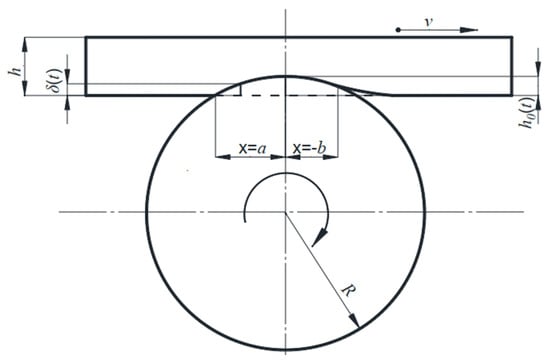 In the illustration of the model, refers to the thickness of the covering layer; denotes the speed of the conveyor belt movement; represents the initial contact point between the conveyor belt and the roller; denotes the position where the conveyor belt and the roller disengaged; represents the radius of the roller; denotes the depth of indentation during stable motion; and represents the depth of indentation at different positions. Previous findings indicate that, assuming that is significantly smaller than , after sequential integration and other numerical operations [23], the following equations can be obtained: