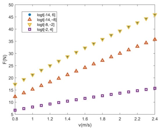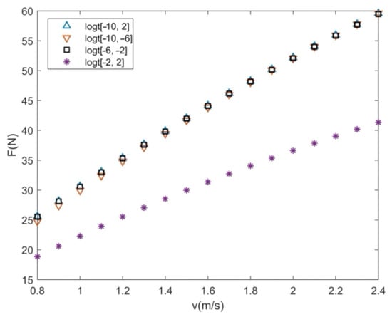 Different time ranges can denote the testing time range corresponding to the relaxation modulus and the relaxation time span of the relaxation time spectrum. These distinct relaxation time ranges also correspond to different characteristic regions of the material, such as glass state, glass transition zone, equilibrium state, and viscous flow state. In this section, the numerical characteristics of indentation rolling resistance under different time range conditions are explored using the “spectral line reduction method”. The parameters of the working conditions were an idler radius () = 0.08 m; a thickness of the conveyor belt cover layer of 0.008 m; and a vertical load of 2000 N/m. Simulation analysis was conducted by varying the magnitude of the speed.