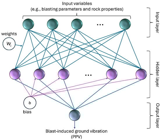 During training, the network is exposed to a sufficient number of input-output patterns, known as training pairs, to learn the underlying relationships between inputs and outputs. The training process involves iteratively adjusting the connection weights until a specified error goal, such as root mean square error (RMSE), is reached. Once trained, the network can be used to predict outputs (e.g., blast-induced ground vibration) for new input data. Figure 1 illustrates an ANN model for predicting blast-induced ground vibration.