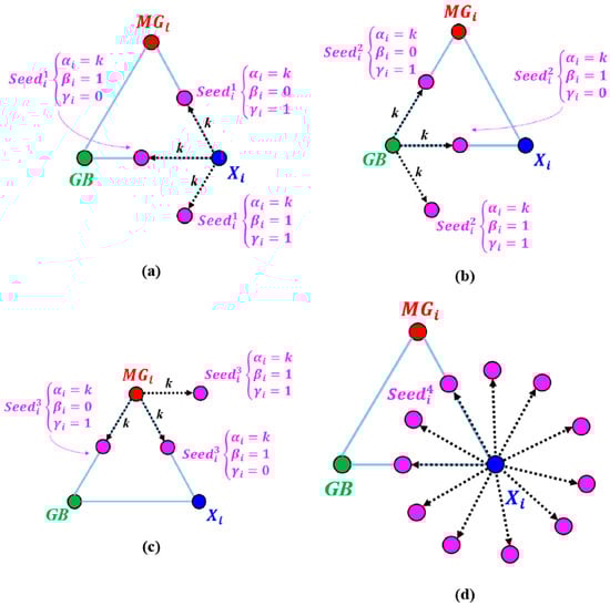 For the seed positioned at the global best solution point , a die with three red and three blue faces is used. Upon rolling the die, if a blue face appears, the seed moves towards the ith candidate ; if a red face appears, it moves towards the ith mean group . Considering the possibility of generating two equal integers, the seed can also move along the line connecting and . This concept is illustrated in Figure 2b, while the mathematical representation is shown in Equation (4).