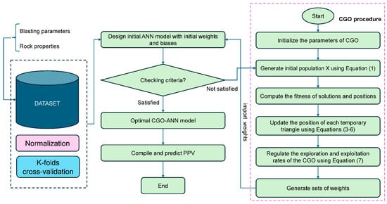 The framework of the CGO-ANN model for predicting blast-induced ground vibration is introduced in Figure 3.