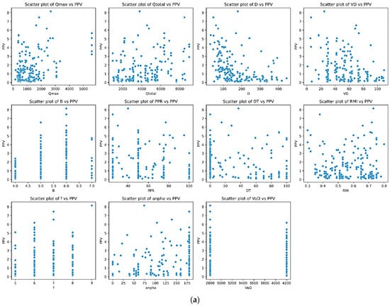 For the development of PPV predictive models, we gathered and updated data from 180 blasting events conducted at the Tonglushan Copper Mine. Our study considered blasting parameters and rock properties as influential factors affecting PPV, consistent with recommendations from previous researchers [,,,,,,,,,,,]. We collected 11 input variables for PPV prediction, including maximum explosive charged per delay (Qmax), total explosive charged per blast (Qtotal), monitoring horizontal distance (D), vertical distance (VD), burden (B), pre-crack penetration rate (PPR), delay time (DT), rock mass integrity coefficient (RMI), Protodiakonov’s hardness (f), angle between the least resistance line direction and monitoring points (α), and velocity of detonation (VoD). PPVs were recorded by seismographs within a range of 0.101 cm/s to 8.15 cm/s. GPS devices were utilized to ascertain the positions of seismographs and blast sites. Subsequently, horizontal and vertical distances, along with α, were computed based on the GPS results. Rock properties such as PPR, RMI, and f were determined in the laboratory, while the remaining parameters were extracted from the blast patterns. Table 1 provides a summary of some statistical criteria of the dataset, and Figure 5 illustrates visualizations of the dataset.