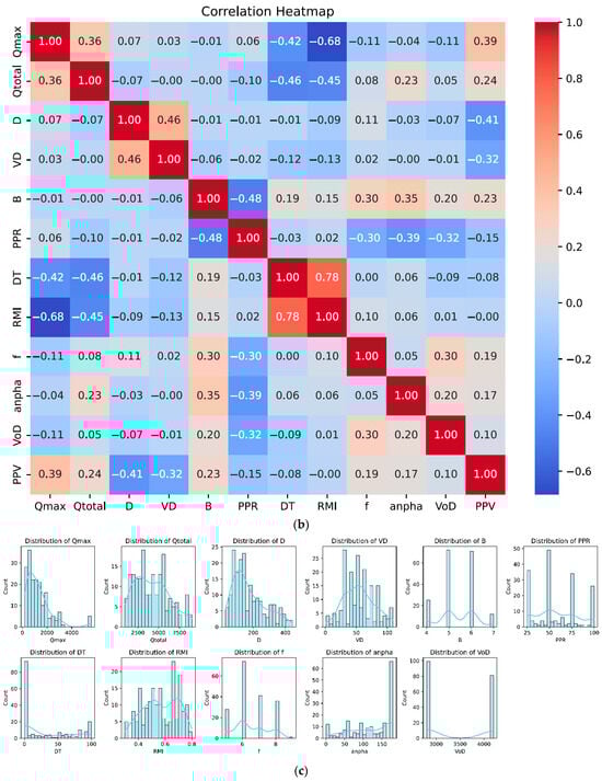 Visualization of the blast-induced ground vibration dataset at the Tonglushan Copper Mine. (a) Scatter plot of each independent variable; (b) correlation heatmap; (c) distribution plots of variables.