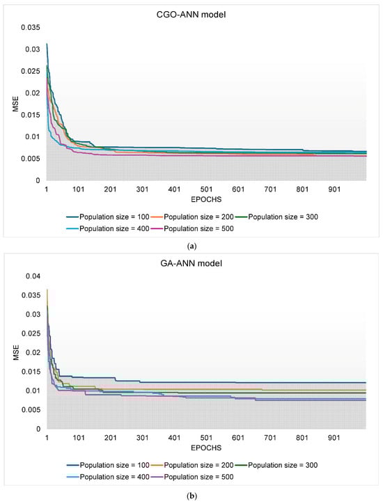 An initial ANN structure with a single hidden layer containing 15 hidden neurons was chosen for this study, utilizing the ReLU activation function. MSE (mean-squared error) served as the objective function for these hybrid models during the training process. The development and optimization process of the CGO-ANN, PSO-ANN, and GA-ANN models are illustrated in Figure 6.