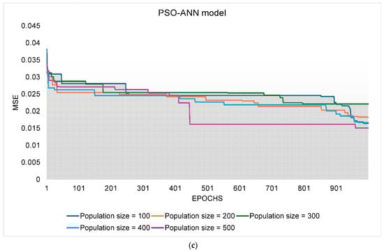 Optimization process of the hybrid models for PPV prediction under different population sizes. (a) CGO-ANN model; (b) GA-ANN model; (c) PSO-ANN model.