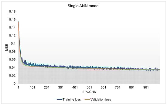 Furthermore, alongside the hybrid models, a standalone ANN was developed for predicting PPV and contrasting it with the proposed CGO-ANN model. The identical datasets, encompassing both training and testing datasets, normalization technique, and structure, were employed in constructing the standalone ANN model. However, in this instance, the backpropagation algorithm was employed to train the ANN model, representing the most prevalent algorithm traditionally used for ANN model training. The performance of the ANN model development is depicted in Figure 7.