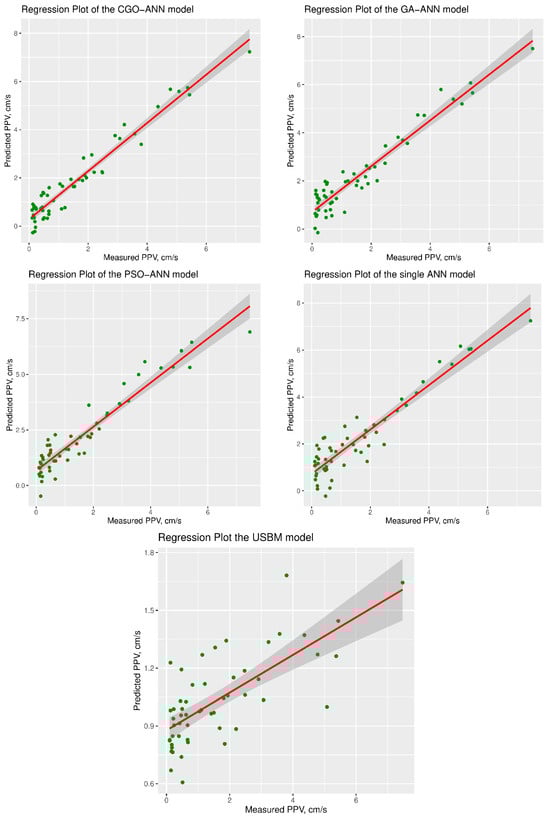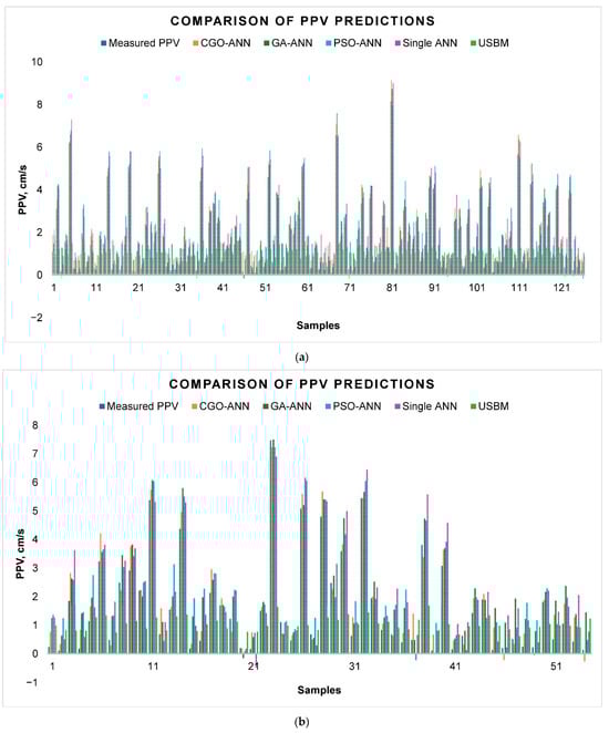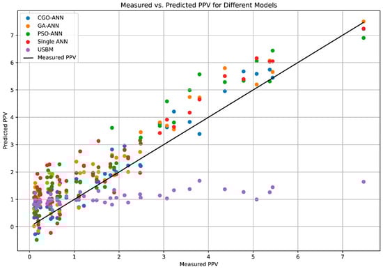 In this section, we present the results and discuss the findings of our study aimed at predicting blast-induced ground vibration. Our study focused on developing and evaluating predictive models to estimate PPV, which is a crucial parameter for assessing the potential impact of blasting operations on nearby structures and the surrounding environment. We specifically investigated the performance of the CGO-ANN, GA-ANN, PSO-ANN, single ANN, and USBM models, with a particular emphasis on the proposed novel CGO-ANN model. The outcome predictions of the CGO-ANN, GA-ANN, PSO-ANN, single ANN, and USBM models are shown in Figure 8 for both training and testing datasets.