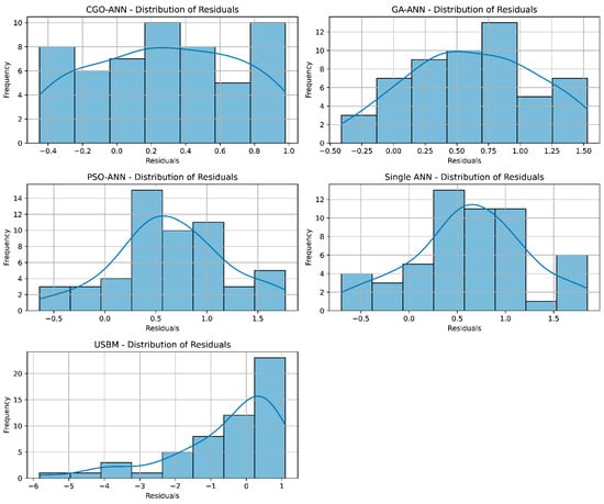 The distribution of residuals provides crucial insights into the accuracy and reliability of the predictive models. Ideally, the residuals should follow a normal distribution, indicating that the model effectively captures the underlying patterns in the data. A normal distribution of residuals suggests that the model accurately accounts for the variability in PPV, with the errors evenly distributed around zero. This implies that the model predicts PPV values with minimal bias and consistent accuracy across the range of observed PPV values. From Figure 11, we can see that the CGO-ANN model follows a normal distribution, indicating that this model effectively captures the underlying patterns in the data. Meanwhile, the other models, such as GA-ANN, PSO-ANN, single ANN, and the USBM model, yielded deviations from a normal distribution of residuals, and this could indicate potential issues with the predictive models, such as the model systematically underestimating or overestimating PPV values in certain ranges. In the GA-ANN, PSO-ANN, single ANN, and USBM models, all of their residuals are positively skewed, indicating that the models tend to underestimate PPV in higher ranges, whereas negatively skewed residuals suggest underestimation in lower ranges. In addition, heteroscedastic residuals imply that the spread of errors varies across different levels of PPV. This suggests that the model’s predictions are less reliable for certain ranges of PPV values, leading to inconsistent prediction accuracy.
