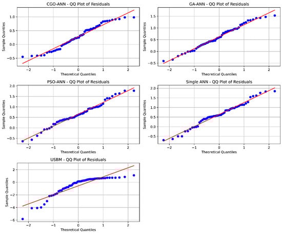 To directly assess the normality of the residuals, a Q–Q plot was employed, providing a clearer indication of deviations from the expected normal distribution. By comparing the observed quantiles of residuals to those of a theoretical normal distribution, as demonstrated in Figure 12, we obtain a more nuanced understanding of residual normality for each PPV predictive model. This integrated approach strengthens the evaluation process, ensuring a thorough examination and resolution of any deviations from normality. Notably, the analysis of Figure 12 highlights insights provided by the CGO-ANN and GA-ANN models regarding specific deviations, aiding in pinpointing areas for model improvement. Specifically, these models exhibit deviations when the residuals of PPV predictions exceed 2 cm/s or fall below −2 cm/s. Conversely, the single ANN model and the USBM model demonstrate pronounced skewness in the residuals, indicating heavy tails or other deviations from normality. These findings underscore the need for further enhancements to these models to ensure more accurate and reliable PPV estimation.