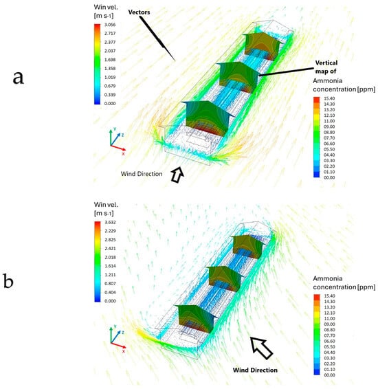 Due to the interaction of factors that determine the farm environment, it is necessary to integrate other climatic variables, such as relative humidity and the concentration of gases such as CO2, for better control of the rabbits’ health. However, according to the objective set in this work, ammonium levels have been observed distributed mainly in the cage area as a function of the wind direction with respect to the farm. It stands out that although it is true that a difference is observed with respect to the simulated wind direction, the difference in ammonium concentration ranges from 2 ppm (Figure 7), so there is a relationship with the results found by Ngwabie et al. [1], Mondaca et al. [19], Flores-Velázquez et al. [27], and Jin et al. [28] regarding the variables that influence the concentration of gases and their interaction with the ventilation rate and temperature.