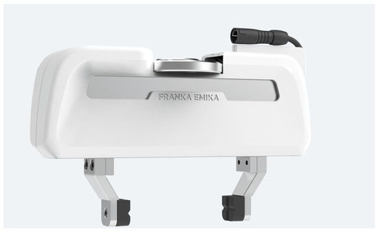 Franka Emika Panda’s end effector. Source: https://pkj-robotics.dk/wp-content/uploads/2020/09/Franka_Emika_Hand_01.jpg, accessed on 25 April 2024.