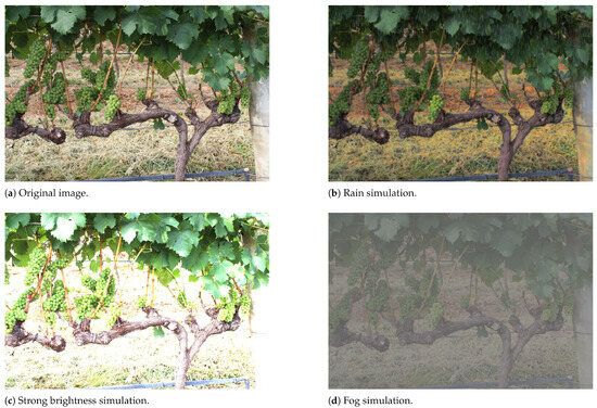 Given the clear mismatch between the number of images to train/validate on WGISD and the single class average on PASCAL VOC 2007+2012, the original WGISD dataset underwent an image augmentation process. Several strategies may be adopted in this regard, for instance, which simulate camera focus, noise or dirty lenses on randomly selected images in the source dataset [26], or by simply integrating additional images from other datasets to obtain a balance for the specific class (like GrapeCS-ML added to the Open Image Dataset v6 restricted to the “grapes” class [27]). The innovative augmentation technique proposed hereafter enriches the dataset by simulating different weather conditions in the vineyard (for example, intense sun, fog, rain, haze and so on). Examples of image augmentation for the WGISD dataset with atmospheric simulations are given in Figure 4. In this way, the resulting vision model is expected to be more robust even in strongly over- or under-exposed scenarios, where the lack of detail and luminance/chrominance distortions considerably undermine the inference process. This technique bears a strong resemblance and shares the same objectives of several cutting-edge studies in image enhancement and restoration methods in CV (among others, [28,29,30] for intelligent image de-hazing and [31,32] for image restoration under extreme low-light conditions).